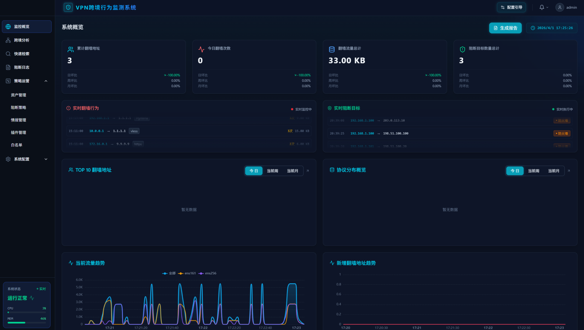 系统支持非法跨境访问行为实时全量监测,搭载专属监控大屏,直观呈现 VPN 风险核心指标、实时阻断数据、风险排行与区域分布等关键信息。实时查看各区域 VPN 客户端活跃数量、流量占比及风险等级,结合高频访问、大流量传输等精细化行为标签,快速定位风险源头。