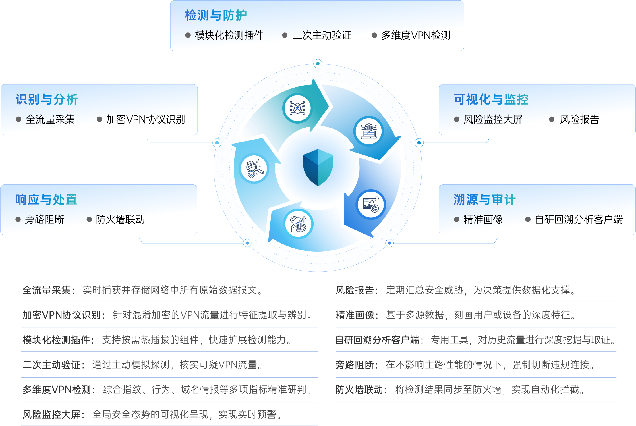 智隼VPN跨境监测系统(FAV)以旁路流量分析为技术基座,深度构建加密VPN流量检测引擎,广泛覆盖SS、SSR、Vmess、Trojan、Vless等隐蔽协议通道,提供VPN协议识别、非法翻墙行为检测、可视化监控、全流量溯源审计、确保复杂环境下网络边界的安全可控,全面满足合规监管要求。
